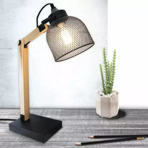 Informations sur la lampe à poser grille en métal noir et bois :